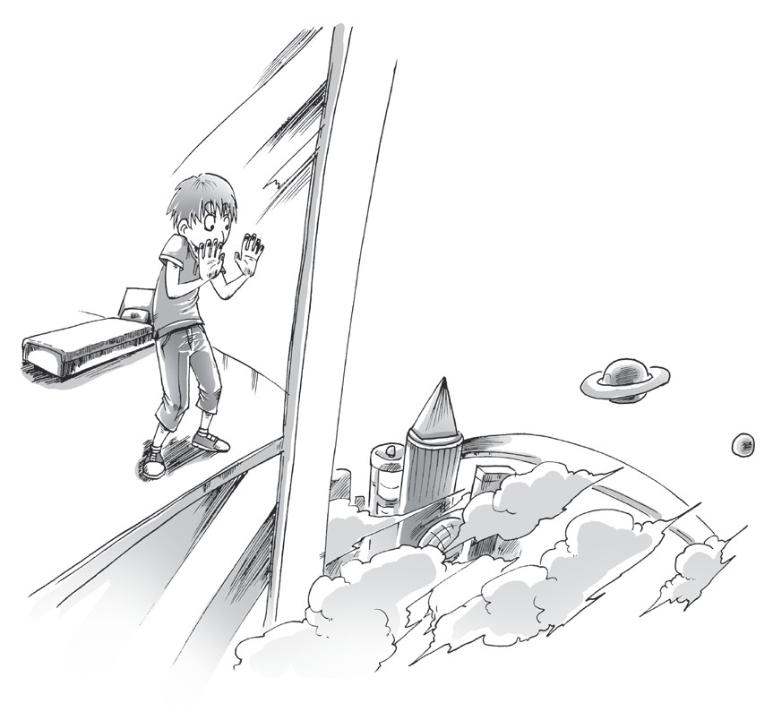 这时,一位类人生物推开了门,只见他:身材高大,头发呈紫色,眼睛是三角形,无眉无睫毛,两个小鼻孔,扁扁的嘴几乎没有嘴唇。我当时吓得晕了过去。醒来时,我大声喊道:“你是谁?我怎么会在这儿?”他叽里咕咚说了一大堆,但我一句也没听懂。他递给我一个像耳麦一样的东西,示意我戴上,随后他也戴上了这个东西。这时我明白了他的意思:“你好,地球上的朋友,你戴上的是‘星球语言转换器’,我的名字叫做德·艾知布朗,是‘超级星球导游’。这是冥王星,我们星球举办每年一度的‘外星人来我星球参观’活动,内容是将其他星球的生物带到我们星球来看看,我们选择了地球,选中了你,因为见到你放假想做作业又不爱做,经常在电脑前发呆。你现在在一家医院里,因为在‘光速飞碟’客运过程中出现了事故,你受了脑伤,所以被送往了医院。”听到这些,我感到十分新奇,也没那么害怕他了。于是,我细细打量着,只见他穿着一层薄如蝉翼般的衣服,但却不透明。随后他又说:“你叫什么名字?地球上的朋友。”“你只要叫我地球上的小朋友就好了。”他说:“哦!对了,之前你已经昏睡了一天,我们给你做了一次全方面的‘康复抚摸术’。我兴奋地跳下了床,但出乎意料的是我瞬间飘了起来,头直撞屋顶,他立刻把我拉了下来,往我脚底下贴了金属类的微型小按钮,我便不再飘了。我惊呼道:“这是怎么回事?”他笑着说:“这是冥王星,并不是地球。冥王星没有引力,我们星球的人只有贴上我们星球发明的‘重力金属贴’才能有重力。”我从窗户探了探头,往下一瞧,大呼道:“哇!好高啊!”他说道:“你现在在这家医院大楼的第2 274层248号病房,这栋楼共有134 340层。”“我想出去走走,请问电梯在哪儿?”这句话好像是全世界最可笑的,他们乐得眼泪都快出来了,随即说了一句:“电梯81年前就被我们淘汰了,我们每人都具备一个‘光速加语音自动飞碟’,想去哪只要说一句话,它会立刻带你去那儿。”