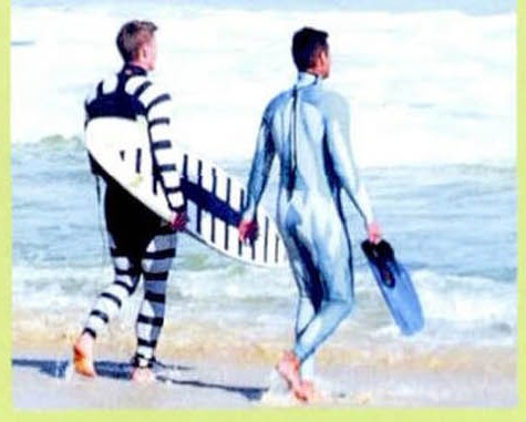 这是两件反鲨鱼潜水衣。鲨鱼看不见这件名为“逃避”的潜水衣的蓝色图案,因为这些海洋动物是色盲。而名为“转向器”的潜水衣的条纹模仿有毒鱼类的颜色,从而可以警告鲨鱼离开。