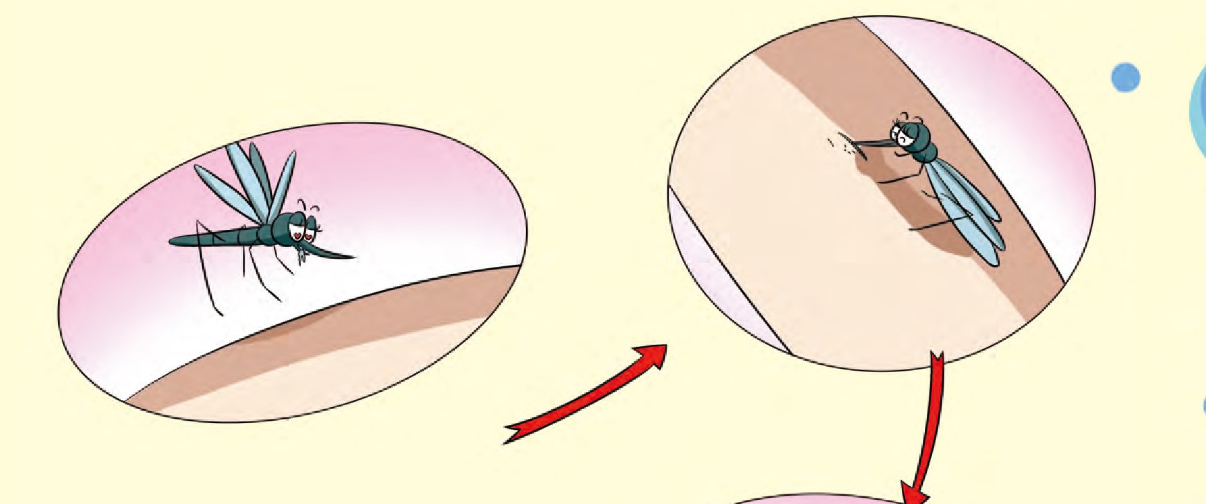 当雌性蚊子找到目标后,会用两腿撑住自己的身体,接着用锯齿形的口器在人的皮肤上割开一道微小的口子,然后用下咽部和上唇传送唾液并吸血。