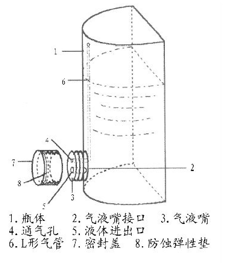 针对以上缺点,我研制出环保储溴瓶。它有两个微型口:一个微型口是气孔,连接1个细导管至瓶内底部,起平衡气压作用,在储溴时,倒置一下进入液体,再正放,在大气压作用下它又起到二次封闭作用;另一个微型口是液溴进出口。这两个口均在瓶的侧底面。瓶的外型为三面平面,一面凸面:可以倒放,正放,横放。保存溴时倒放,挥发出的溴蒸气在瓶的上方。由于瓶的上方是全封闭的,气体不能逸出,且形成饱和蒸气压时,液溴挥发量不再增加。两个微型口,表面积小且易密封。液溴表面张力大,在大气压的作用下,液溴蒸气几乎不能逸出。