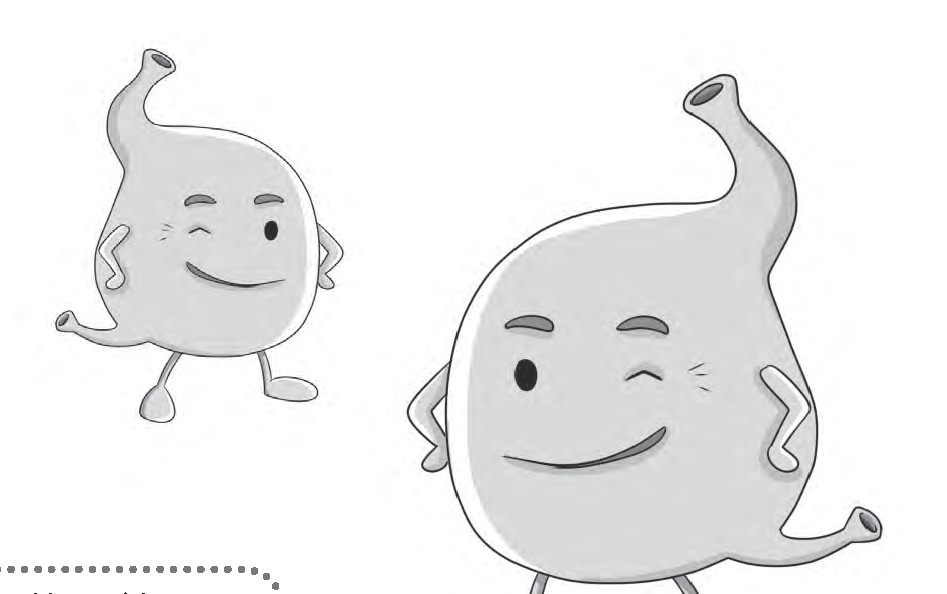 多多博士赶紧拿出几根能量棒递给笨笨,只有补充好体力才能继续探险呀。等笨笨慢吞吞地吃完后,博士惊喜地发现食物粒不再往下掉落了,他长长地舒了口气,准备开足马力前进。谁知这个大口袋竟开始有规律地蠕动起来,掉下来的食物被混在液体中,转啊转,磨呀磨,变成了粥一样的半液体状的食糜。