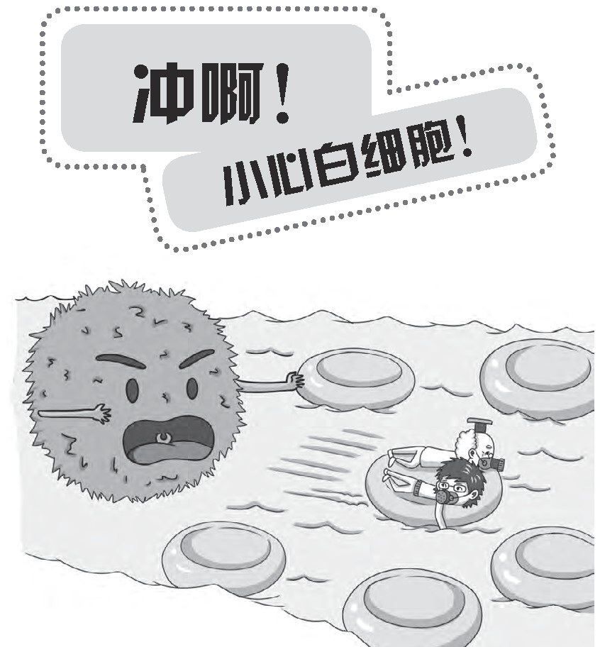 “糟了,白细胞!它会把咱们吞下去的!快,加速前进。”博士和笨笨开始用手划动着血液,让红细胞速度更快一点,这才躲过了白细胞小兵的追捕。