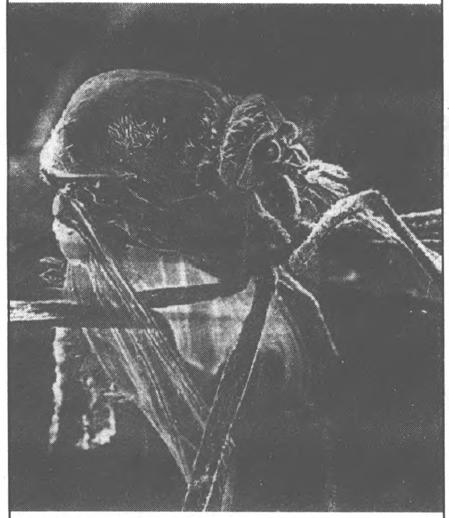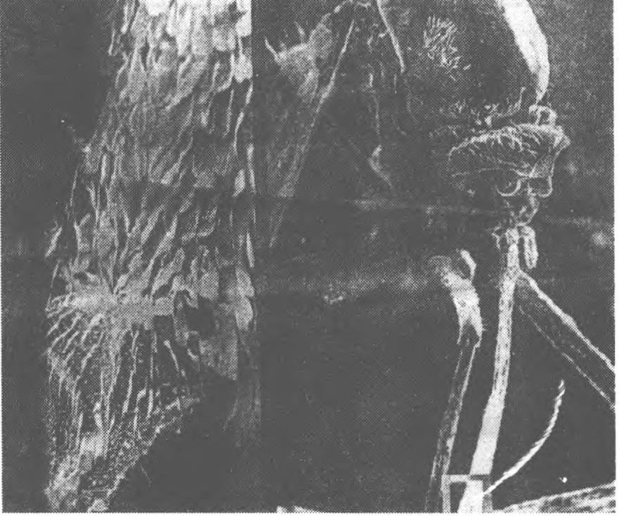 ②观察后发现:蚊子的主要进食工具是头部用于吸血的针刺状的嘴。从放大后的照片上可以看到(照片三),蚊子的针刺又细又尖,难怪它能悄悄地刺入皮肤而不被人们所发现。更有趣的是,我发现在蚊子嘴部的针刺表面有许多麦芒样的倒毛,我就这个观察结果询问了医学教授,他们认为:至今中外研究上还未见有报道。我分析:蚊子针刺状嘴的表面麦芒样倒毛可能具有这样的功能,当蚊子嘴刺入皮肤后,倒毛张开,吸血时针刺就不易从皮肤内滑出;一旦有动静,倒毛收缩,针刺就能很快拔出,蚊子振翅逃跑。