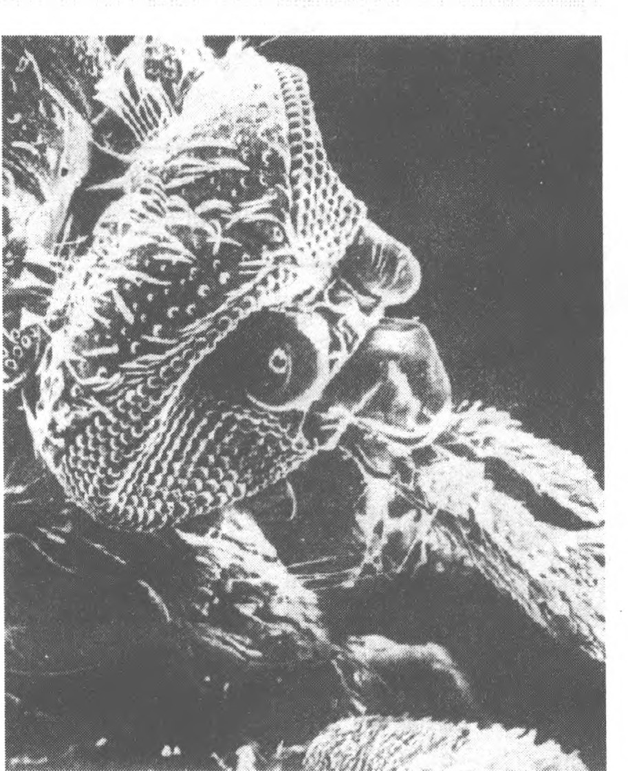 ②对蚊子头部进一步放大至100倍并仔细观察(照片二)。观察结果:照片二显示了蚊子头部、口器及前肢。可以发现蚊子有一双亮晶晶的单眼,单眼中间有黑黑的眼珠。在单眼的后面有一片复眼,排列整齐紧密。仔细观察便会发现:复眼呈球形或六棱形晶体状。蚊子头顶有小孔和触毛,口器长长像麦穗状。前肢上有许多毛鳞。