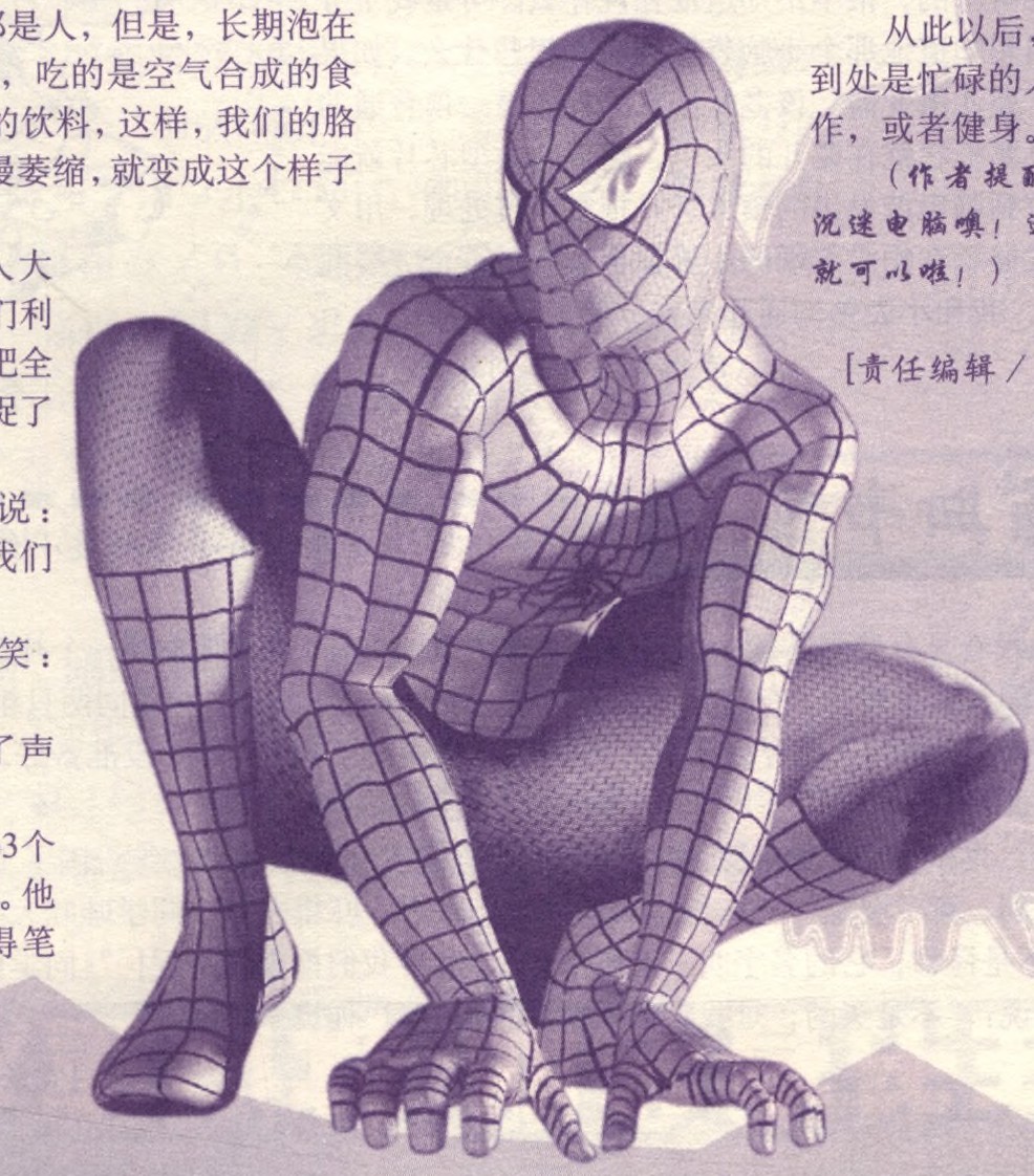 蜘蛛人点了一下电脑,电脑立刻播放出一首悲哀的曲子,蜘蛛人一把鼻涕一把泪地哭诉:“从前,我们都是人,但是,长期泡在电脑前面,从不出门,吃的是空气合成的食品,喝的是空中传送的饮料,这样,我们的胳膊和腿从来不用,慢慢萎缩,就变成这个样子了!”
