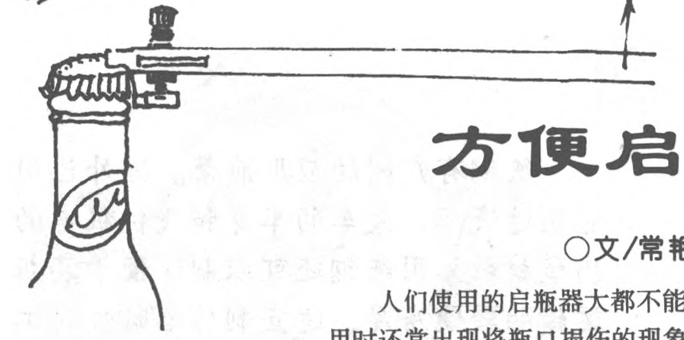 人们使用的启瓶器大都不能调节,只能开启一类瓶子。有的钩状启瓶器在使用时还常出现将瓶口损伤的现象。在科技活动小组教师的指导下,我终于发明了一种方便启瓶器,弥补了以上不足。