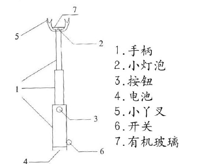黄妙霜同学在使用衣叉的时候,发现了不便之处。首先,她提出问题:能不能给衣叉加一个光源?加在哪里?怎样用电路来实现?其次是解决问题:加一个小灯泡,用小电池作为电源,用按钮开关控制。尤其值得一提的是,黄妙霜同学别具匠心地用有机玻璃密封住小灯泡,这样既透光又能防止碰碎灯泡,更能有效地防止因淋水而造成的电路短路现象。最后她还为衣叉设置了伸缩功能。经过重新改造后,衣叉的实用性更强,为我们的生活带来了更多的方便。