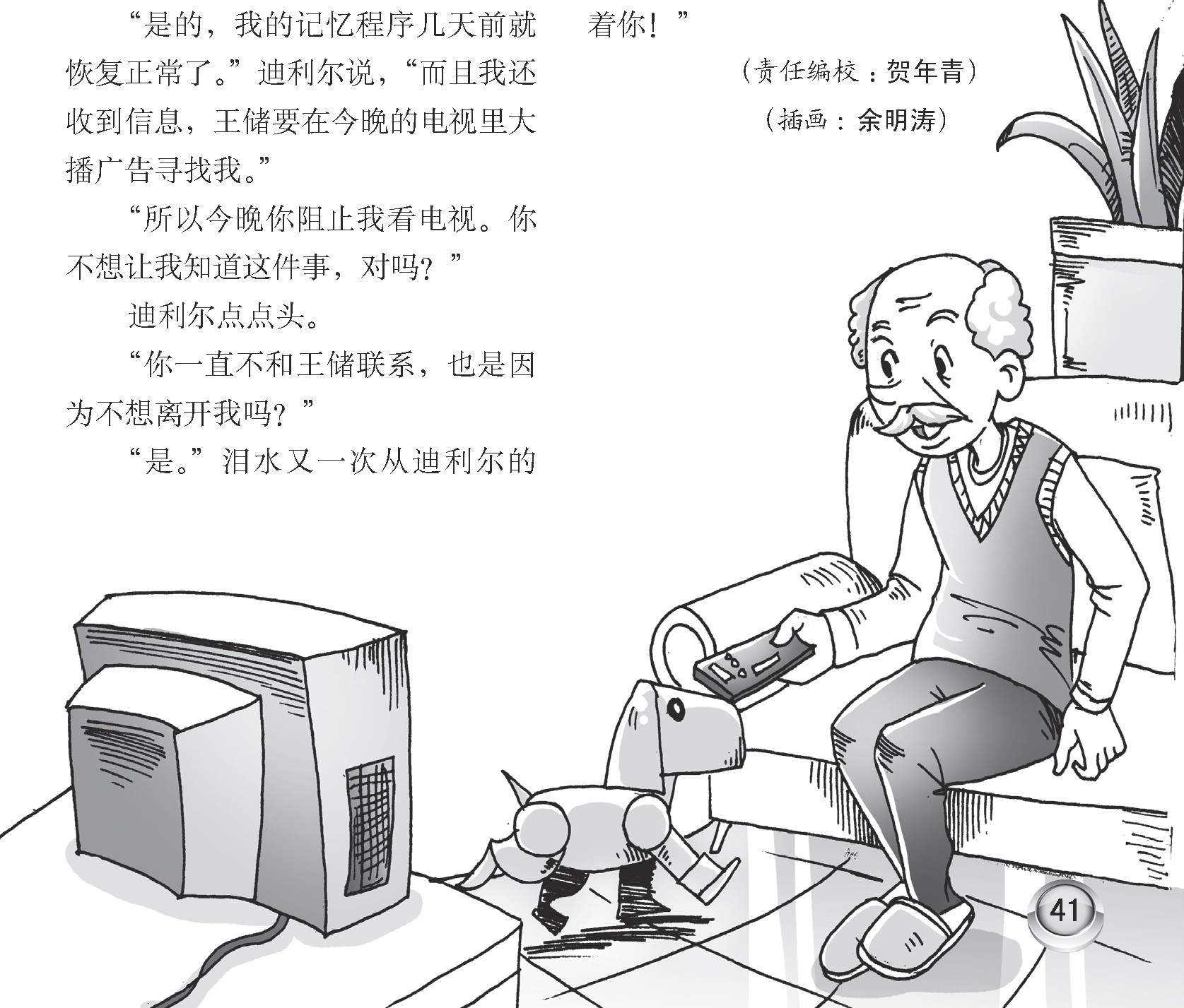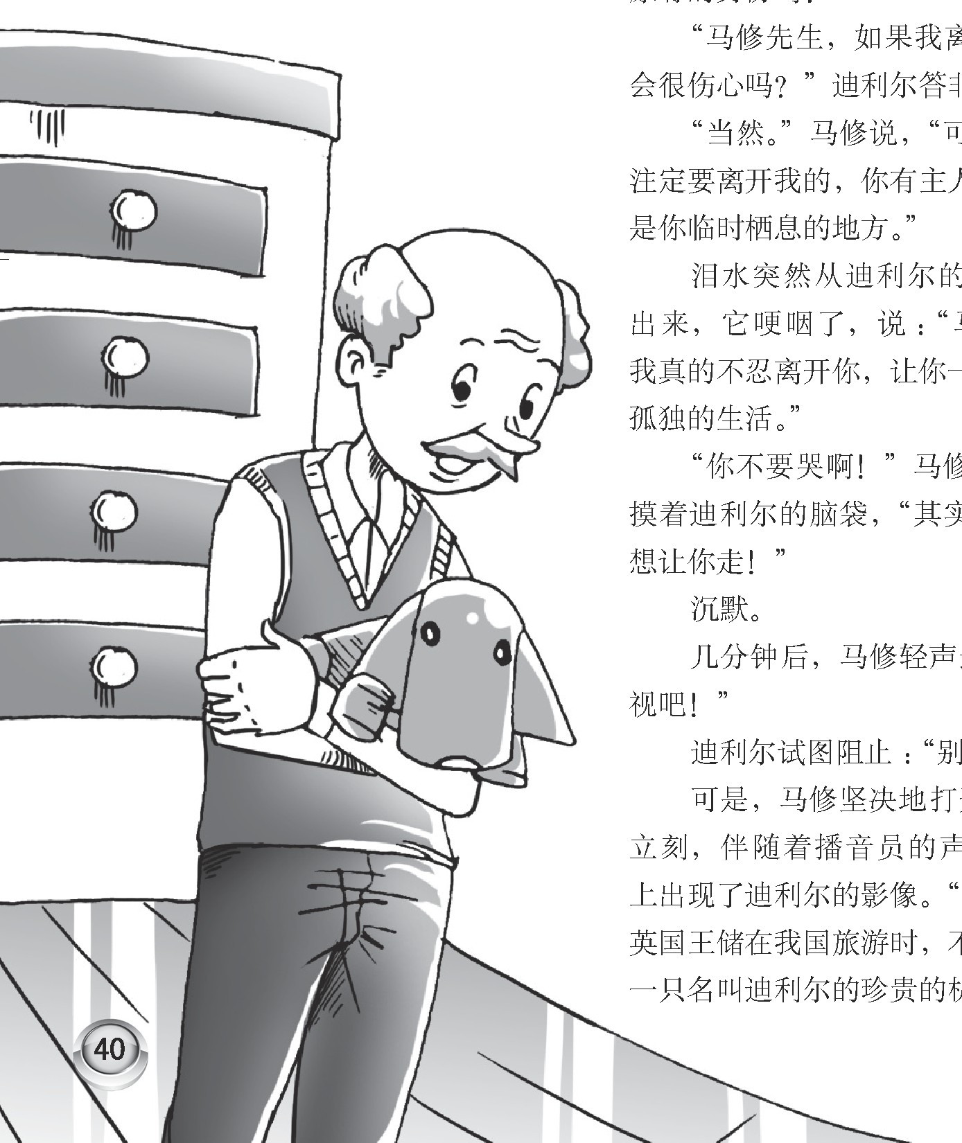 “不,不……”迪利尔慌忙睁开眼说。它从马修的怀中挣脱出来,一跃跳到沙发的角落里说:“马修先生,不是说好今晚不看电视吗?”
