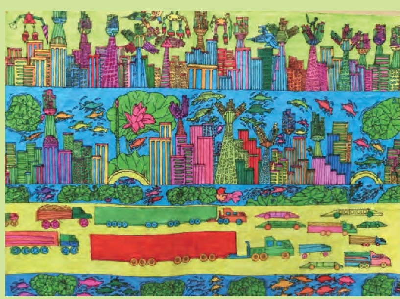这是一座能抵御洪水、海啸、地震等自然灾害的城市,它的楼房造型奇异,形态万千,而且所有的房子都是悬浮在水上的,既节约了空间又保护了我们的环境。