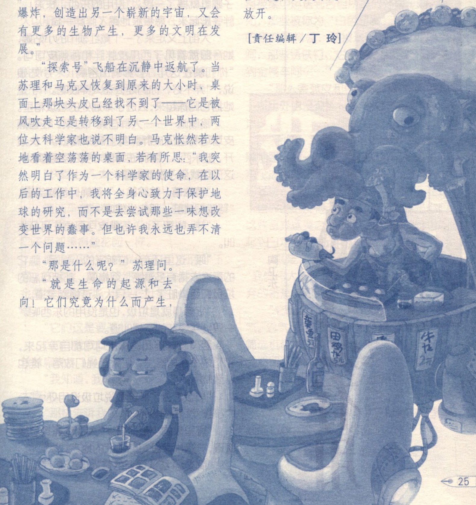 “探索号”飞船在沉静中返航了。当苏理和马克又恢复到原来的大小时,桌面上那块头皮已经找不到了——它是被风吹走还是转移到了另一个世界中,两位大科学家也说不明白。马克怅然若失地看着空荡荡的桌面,若有所思:“我突然明白了作为一个科学家的使命,在以后的工作中,我将全身心致力于保护地球的研究,而不是去尝试那些一味想改变世界的蠢事。但也许我永远也弄不清一个问题……”