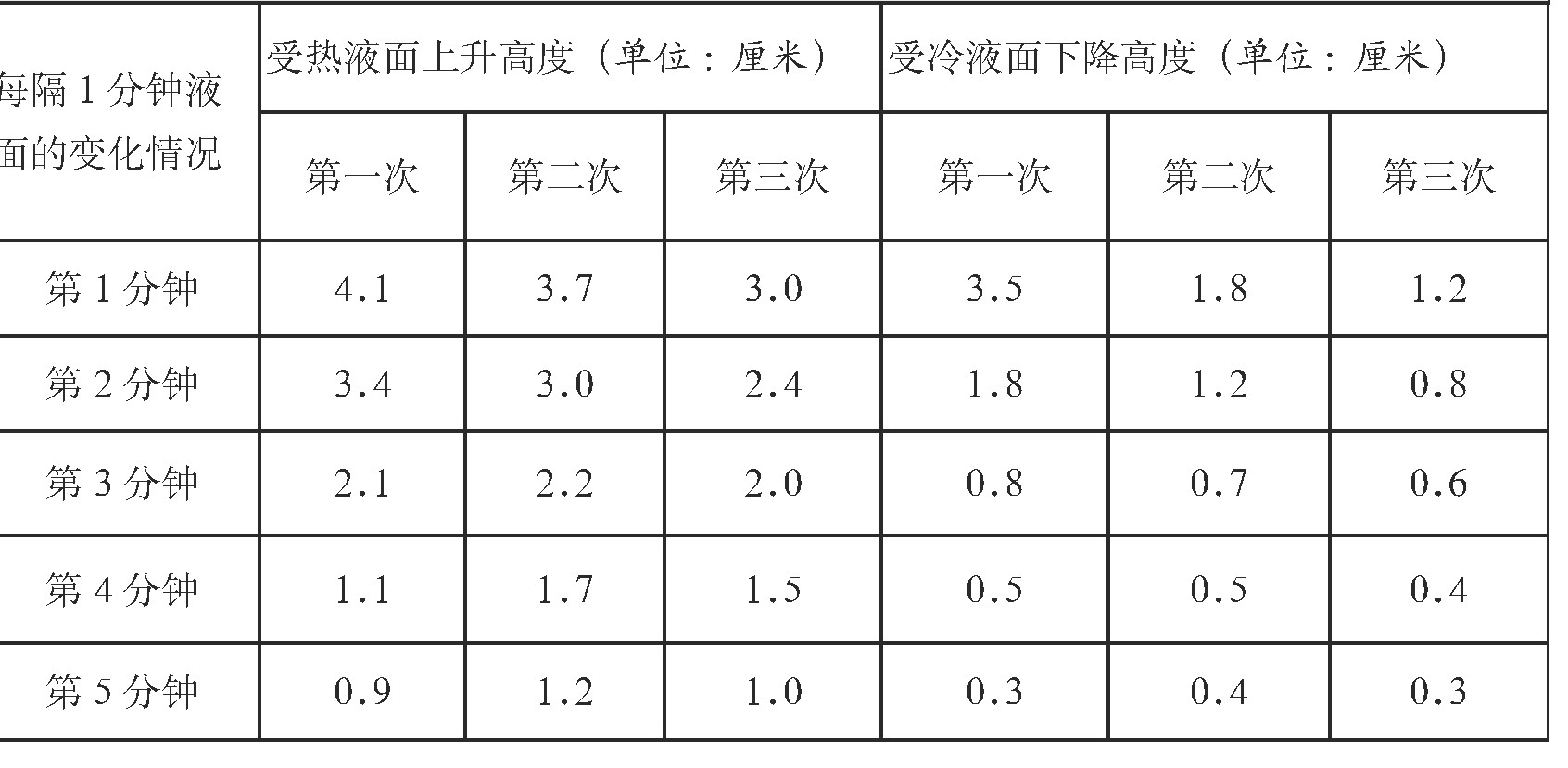 实验结果 没有二氧化碳气体的汽水受热后液面快速上升,受冷后液面下降,且每分钟液体受热时液面上升高度大于液体受冷时的液面下降高度,所以液体的热胀速度大于冷缩速度。