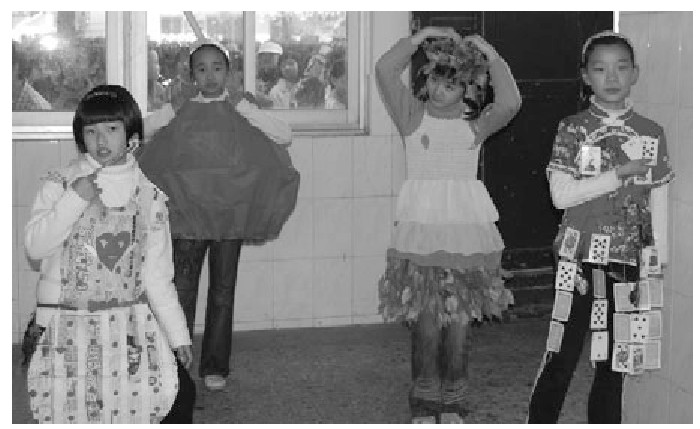 呀,原来是一群同学正在玩Cosplay呢,他们穿着新奇、鲜艳的衣服,装扮成了各种各样的动漫人物。不过这可不是重点,重点是这些同学身上的奇特服装都是用各种废弃物品做成的,有废弃的塑料袋、破烂的雨衣、过期了的日历……真是创意十足啊!原来这是科技节上的一个项目,鼓励同学们将废弃物品利用起来,既达到了废物利用的目的,还开发了同学们的创意,更锻炼了动手能力,真是一举多得啊!