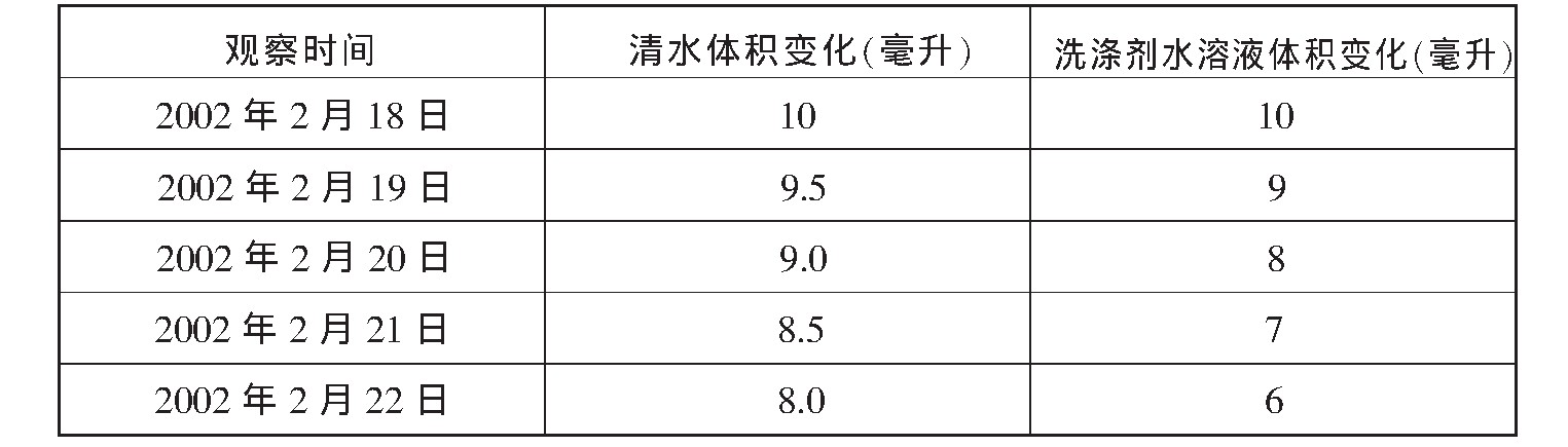水面张力减少,会使水的性质发生怎样的变化?于是,我又设计了 一个“蒸发实验”来研究这个问题。将等量的清水和洗涤剂水溶液分别盛入量杯,使它们自然蒸发,结果为: