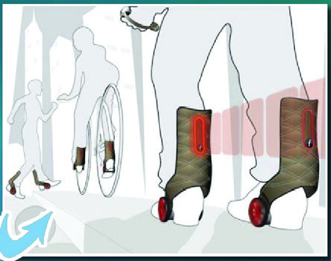 这款鞋配有发动机和变速箱,通过手上的遥控器控制刹车和启动。为保证使用者的安全,还贴心地在鞋套后侧设置了尾灯。它可以很方便地从滑行状态转变为步行状态,不影响使用者的正常行走。时速达每小时1 6千米,适合工作地点离家不远的上班族使用。