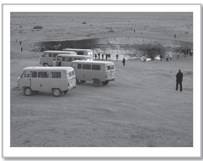 说起这个大坑产生的原因,还要回到20世纪70年代。当时,苏联的一支钻探队和地理科学家在该地区考察、钻探天然气资源。正当他们进行钻探的时候,突然所有的钻探设备和临时营地都掉进了脚下一个巨大的地下洞穴中。众多的考察队员惊叹不已,虽然心中充满疑问,但没有人敢接近洞口进行具体的调查,因为这个洞穴中充满了天然气,只要接触到一点火星,随时都有燃烧爆炸的可能。