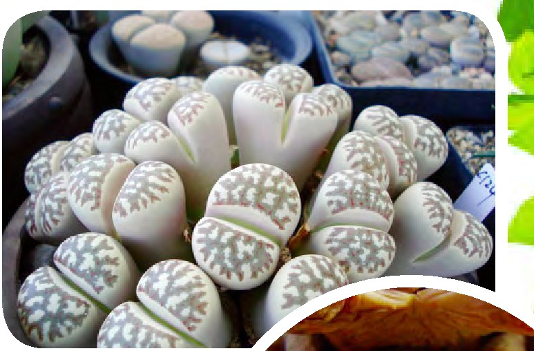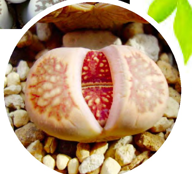 生石花又名石头玉,原产于非洲南部,是多年生小型多肉植物。三四年生的生石花秋季从对生叶的中间缝隙中开出黄、白、粉等多色花朵,多在下午开放,傍晚闭合,次日午后又开。因形似石头、色彩斑斓,成为很受欢迎的观赏植物,被誉为“有生命的石头”。
