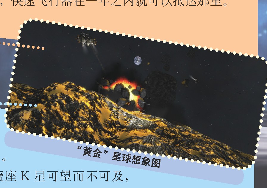 还有一个更遥远的“黄金”星球是巨蟹座K星。但是,与爱神星相比,巨蟹座K星可望而不可及,因为它距地球有2 500光年,光都要跑2 500年,更别说驾驶宇宙飞船的人了,实在是太遥远了。除非开发出科幻小说中“虫洞”一类的交通工具,否则就难以抵达巨蟹座K星那诱人的金矿了。