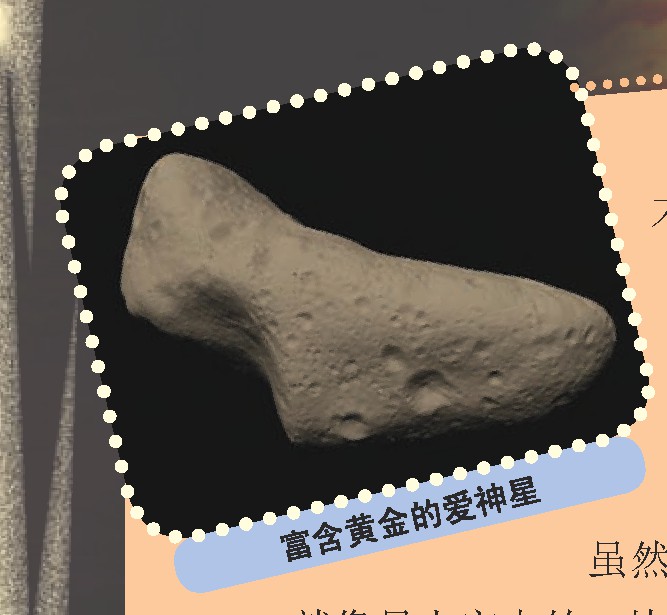 地球表面蕴含黄金最多的地方是海洋。不幸的是,至今没人找到从海洋中提炼黄金的有效方法。然而,与太空中的黄金储量相比,这只是小巫见大巫,离我们最近的一颗“黄金”星球是爱神星。爱神星是一颗形状不规则的小行星,被称为“胖香蕉”。虽然与地球相比,这颗小行星的体积微不足道,就像是太空中的一块石头,但是爱神星富含黄金,黄金总量就超过地球有史以来开采的黄金数量总和。更加令人振奋的是,这颗小行星距离地球只有2 200万千米,快速飞行器在一年之内就可以抵达那里。