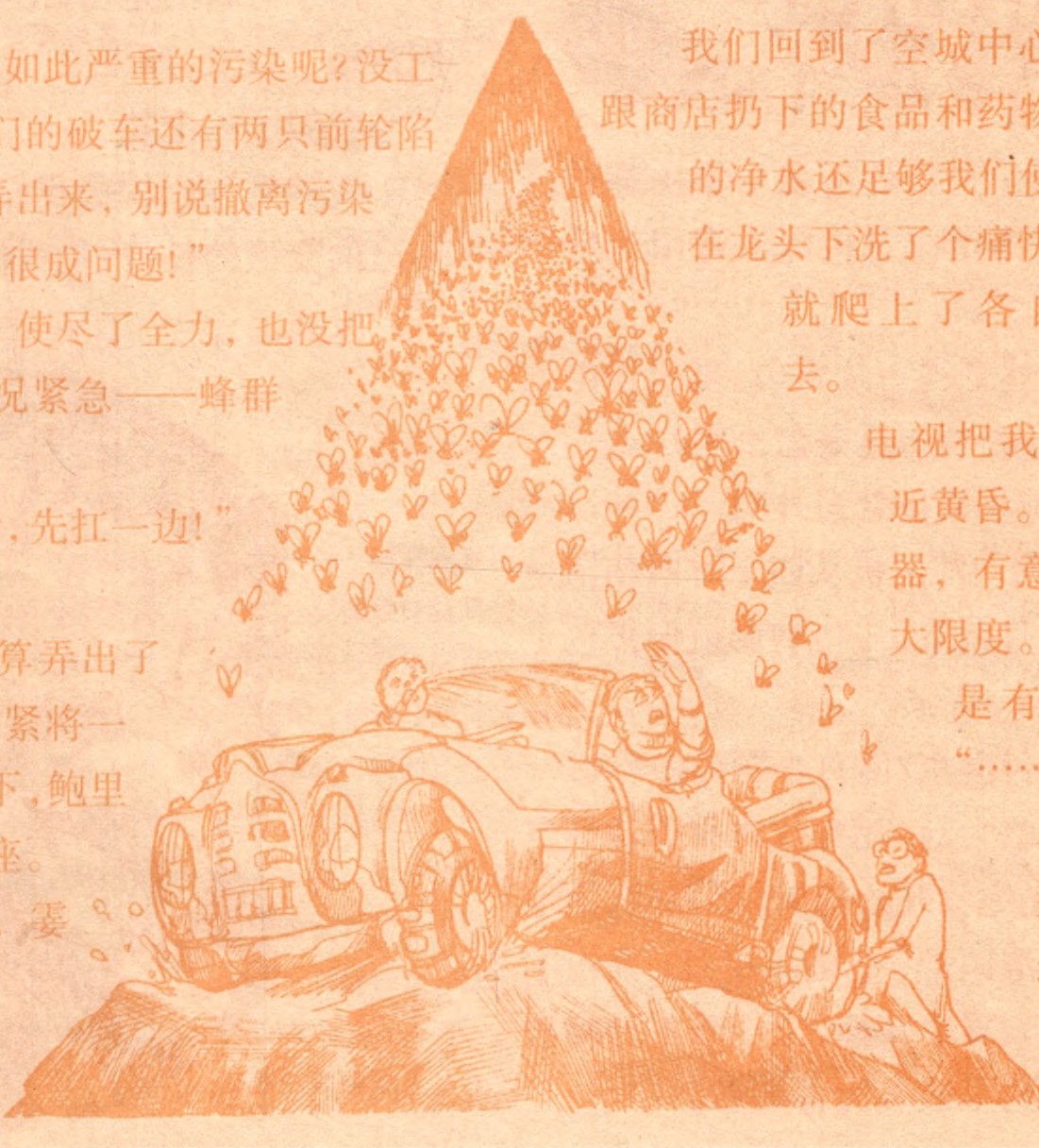 “据专家推测,正是工业污染突然加剧的毒素和射线,使昆虫中这种神经节特别发达的种类产生了突变……估计三名中学生都被巨蜂杀害……警方决定派飞机深入毒沼全歼巨蜂……”