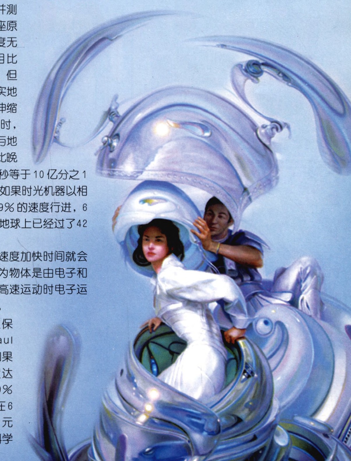 不过,按照爱因斯坦的理论,时间本身就是一种光速,物体运动的速度越快,时间就会相对变慢(对运动的物体而言)。科学家已经通过原子钟证实了时间的伸缩。1971年,美国华盛顿大学的哈费勒(J. C. Hafele)和美国海军天文台的理查德·基廷(Richard Keating)两位物理学家作了环球旅行并测量了飞机上的4座原子钟。飞机的速度无法和光的速度相比(相差几百万倍),但 是科学家们却真实地 捕捉到了时间的伸缩 性:在旅行结束时,飞机上的原子钟与地面上的原子钟相比晚 了 59纳秒(1纳秒等于10亿分之1秒)。推算起来,如果时光机器以相当于光速99.9999%的速度行进,6年下来,相对地,地球上已经过了42万年。
