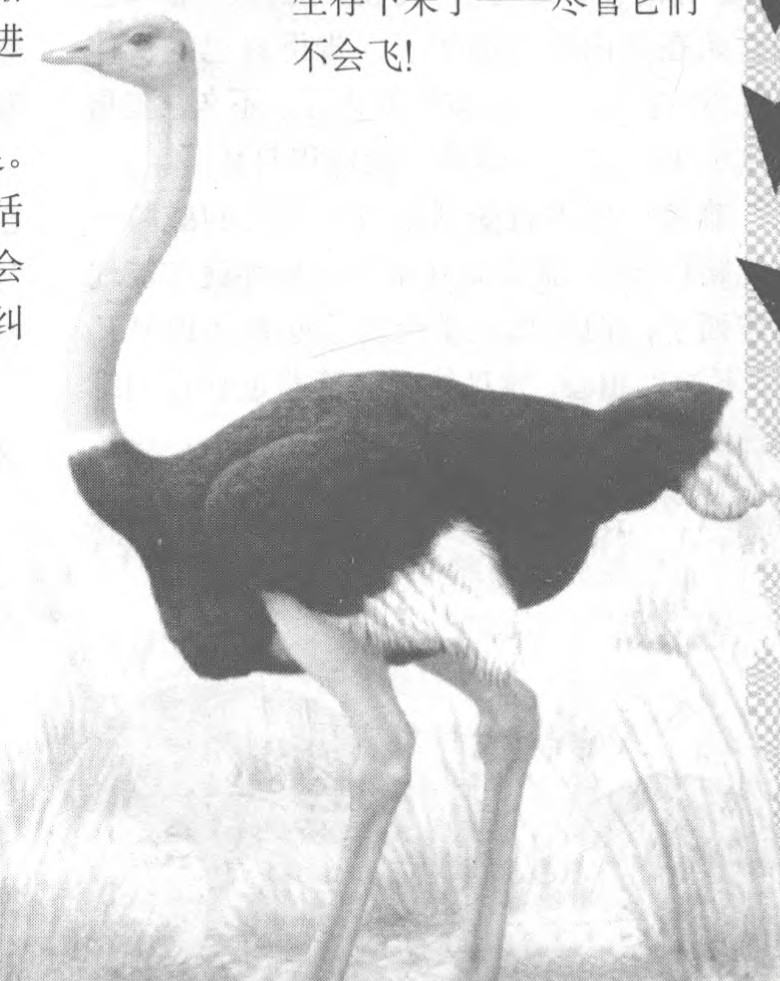 尽管自然的进化剥夺了鸵鸟飞翔的权利,也没有赋予它们任何进攻和伤害敌人的能力,但是,鸵鸟还是生存下来了,凭借着顽强的生命力,凭借着强有力的腿脚。它们在充满危险的、广阔的非洲草原上生存下来了——尽管它们不会飞!