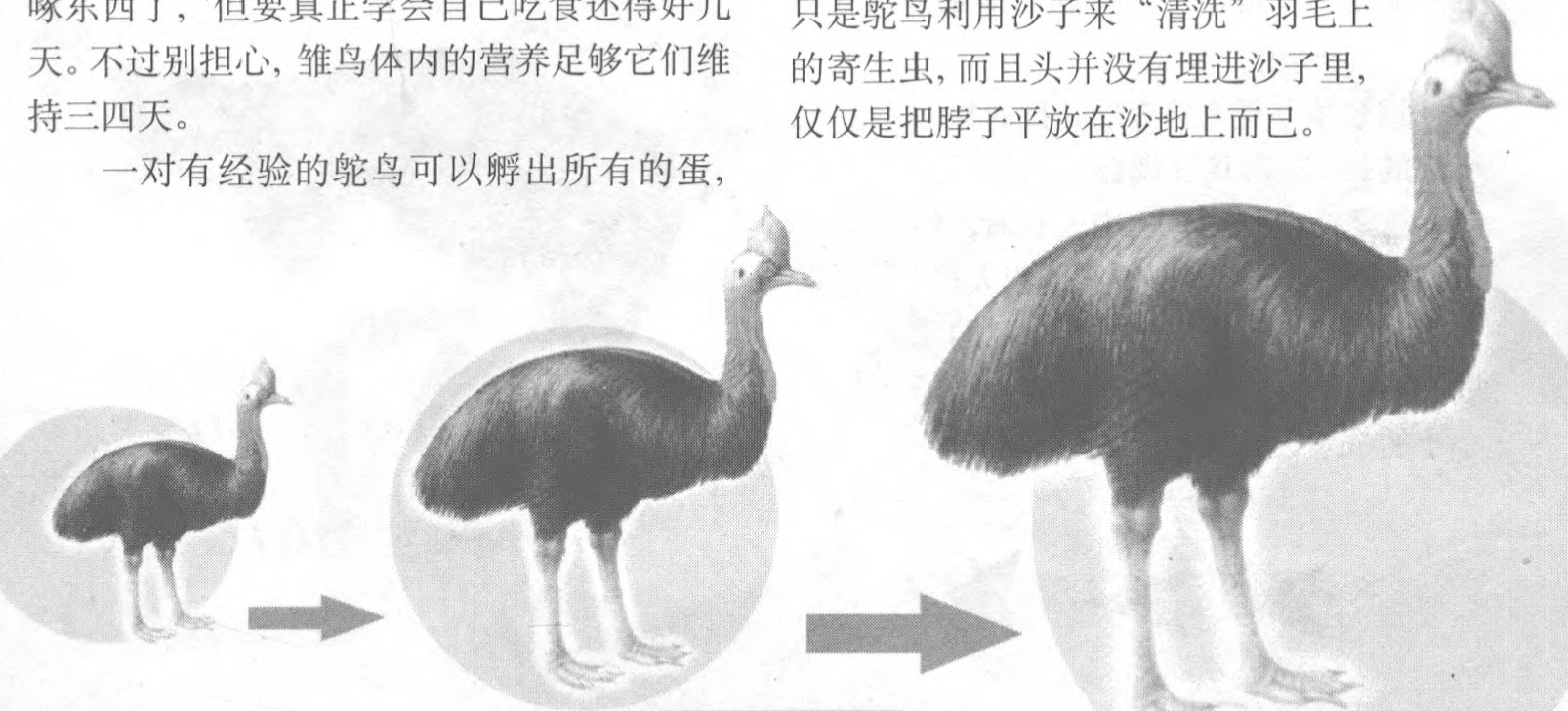 怪异而坚硬的脚爪补偿了这一缺陷,鸵鸟每小时可以奔跑70千米。事实上,它是当今鸟类中最奇特的一种。它们的生活千奇百怪,充满了神奇色彩,这当然包括“童年生活”,它们的“童年”是从蛋开始的。