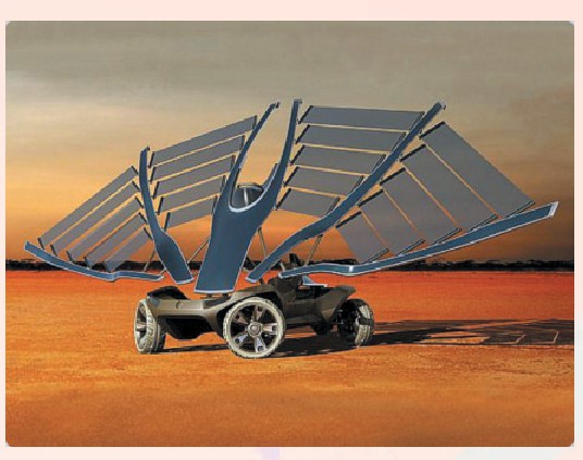 法国人卢阿让等人设计的这款“翼龙”汽车,看上去就像是来自侏罗纪时代的翼龙。这款汽车“长”了好几片长长的“翅膀”,这就是它的动力之源,因为“翅膀”上有不少太阳能电池板。在低速行驶或停下来时,“翅膀”展开,让电池板充分吸收太阳能。若是高速行驶”时,长长的“翅膀”给汽车带来了巨大的阻力,此时必须收回“翅膀”。虽然此时效率低了些,但是照样可以吸收太阳能。