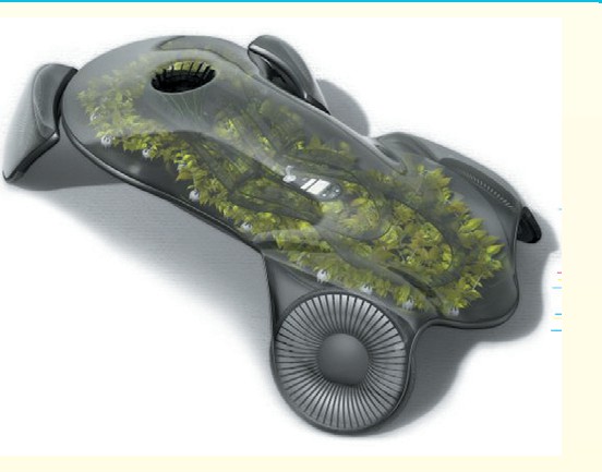 美国人卡拉威尔等人设计的这款“光合作用”汽车,看上去像是移动的小花园。汽车中有不少绿色植物,真真假假混在一起,让人分辨不清。其中假的植物居多,它们是绿色的叶片状太阳能电池,可以为汽车行驶提供能量。真的植物比较少,可以吸收司机呼出的二氧化碳,产生氧气,可以让汽车内的空气更加清新。由于植物占据了大量的位置,司机的位置被挤到汽车中部。该车的轮子也很特别,轮子中镶嵌了不少片状的太阳能电池板。由于太阳能电池提供的能量有限,该车的车身主要是塑料,而且每辆汽车只能乘坐一人。