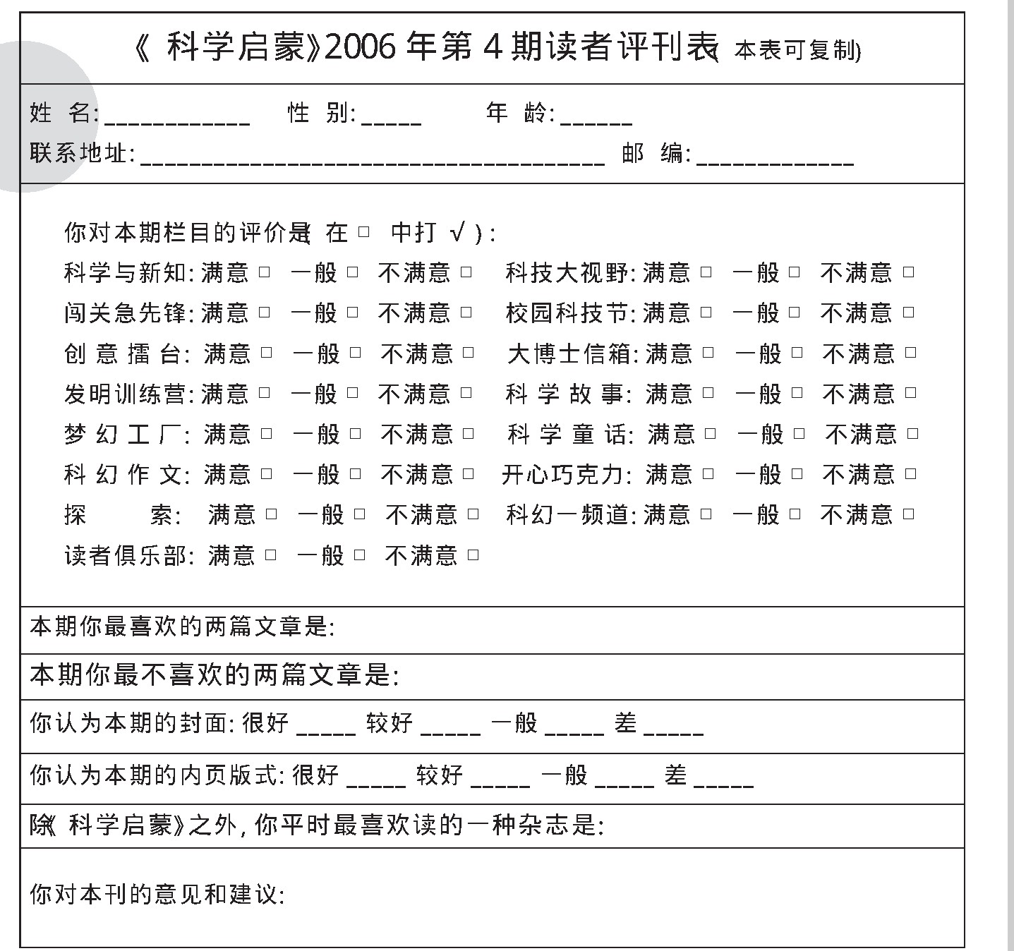请将你的回答写在表格里,然后寄给我们,我们的地址是: