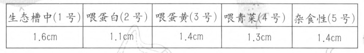 2、3、4、5号水槽中要每天换水,清除蝌蚪吃剩下的食物,1号水槽中水一直不换。在饲养过程中,我们观察到,只喂青菜的蝌蚪不活泼,有的翻着身子,肚皮朝上。喂蛋黄的蝌蚪很活泼,喂蛋白的蝌蚪不活泼,吃得也很少,杂食性的小蝌蚪,很活泼,快活地游来游去。1号水槽中的蝌蚪最活泼,长得也很快。