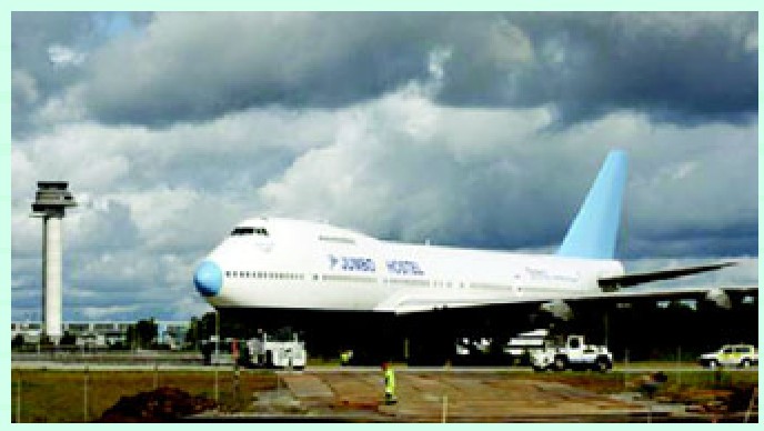 瑞典阿尔兰达机场的跑道上停着一架大型喷气式客机,这架喷气客机已处于报废状态,然而一位大胆富有创新精神的商人将它再次利用,把它改造成一个拥有25个房间和1个咖啡屋的旅馆,为乘客们提供了一个廉价住宿场所,以解决机场附近缺少休息地点之急。