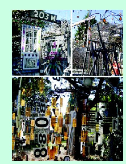 户外艺术家理查德·特雷西以制造“亮丽艺术品”而闻名,在过去20年里,他能将垃圾变成壮观美丽的雕塑作品。特雷西从邻居的垃圾堆里寻找一些丢弃物品,以唤起他的艺术灵感,使其户外艺术走廊变得更加绚丽多彩。他的户外艺术走廊每年吸引了数千名游客,原本在垃圾堆中看似无用的泡沫塑料板、西红柿笼子、溜冰鞋等经特雷西之手,便变废为宝,散发出艺术的光芒。