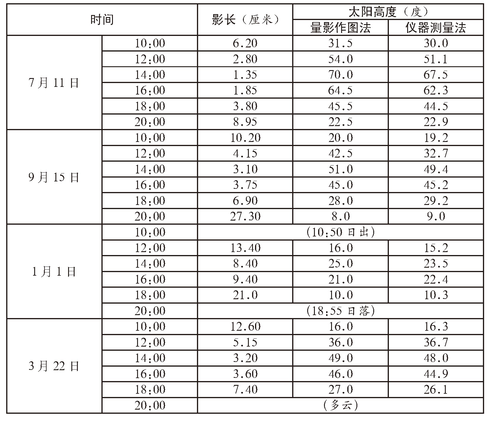 四季太阳高度测量数据