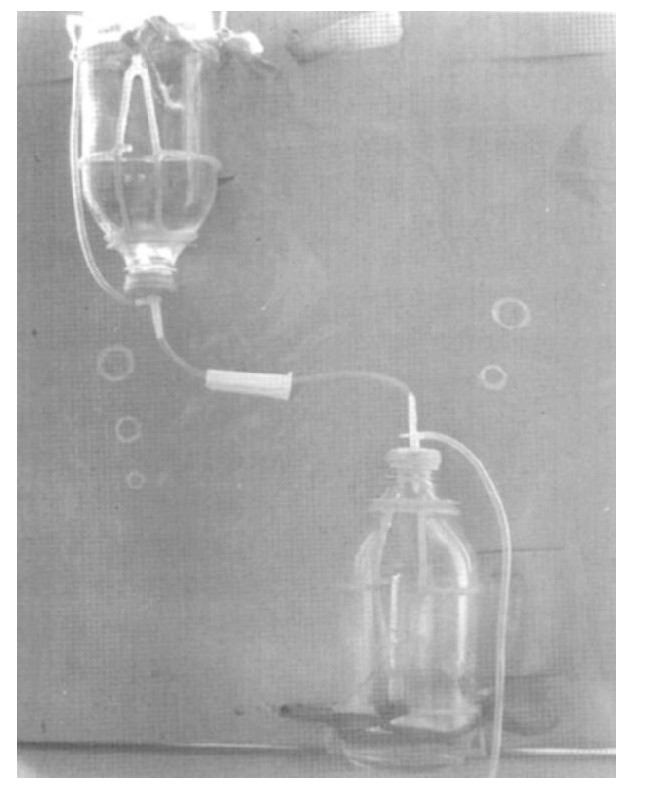 我设计的鱼缸供氧器是将一个输液瓶装满水倒挂在高处,插入穿刺器,使水顺着输液管流到下方空的输液瓶中,把空输液瓶中的空气排入鱼缸中,就可以为鱼缸供氧了。当上方瓶中的水排完后,还可以交换两瓶的位置,继续排气供氧。我用该作品进行鱼缸供氧实验,发现容量为500mL的供氧器可以为一个规格为40cm×25cm×25cm的鱼缸连续供氧4 8小时。