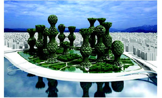 漂浮生态城市是为应对因气候变化等原因造成的生态灾难而设计的,是一种两栖的、可自给自足的城市。城市可以容纳5万人生活于其中,城市中还有人类生活所必需的各种植物和动物。城市的底部有一个沉没于水中的礁湖,它可以净化雨水供居民饮用。