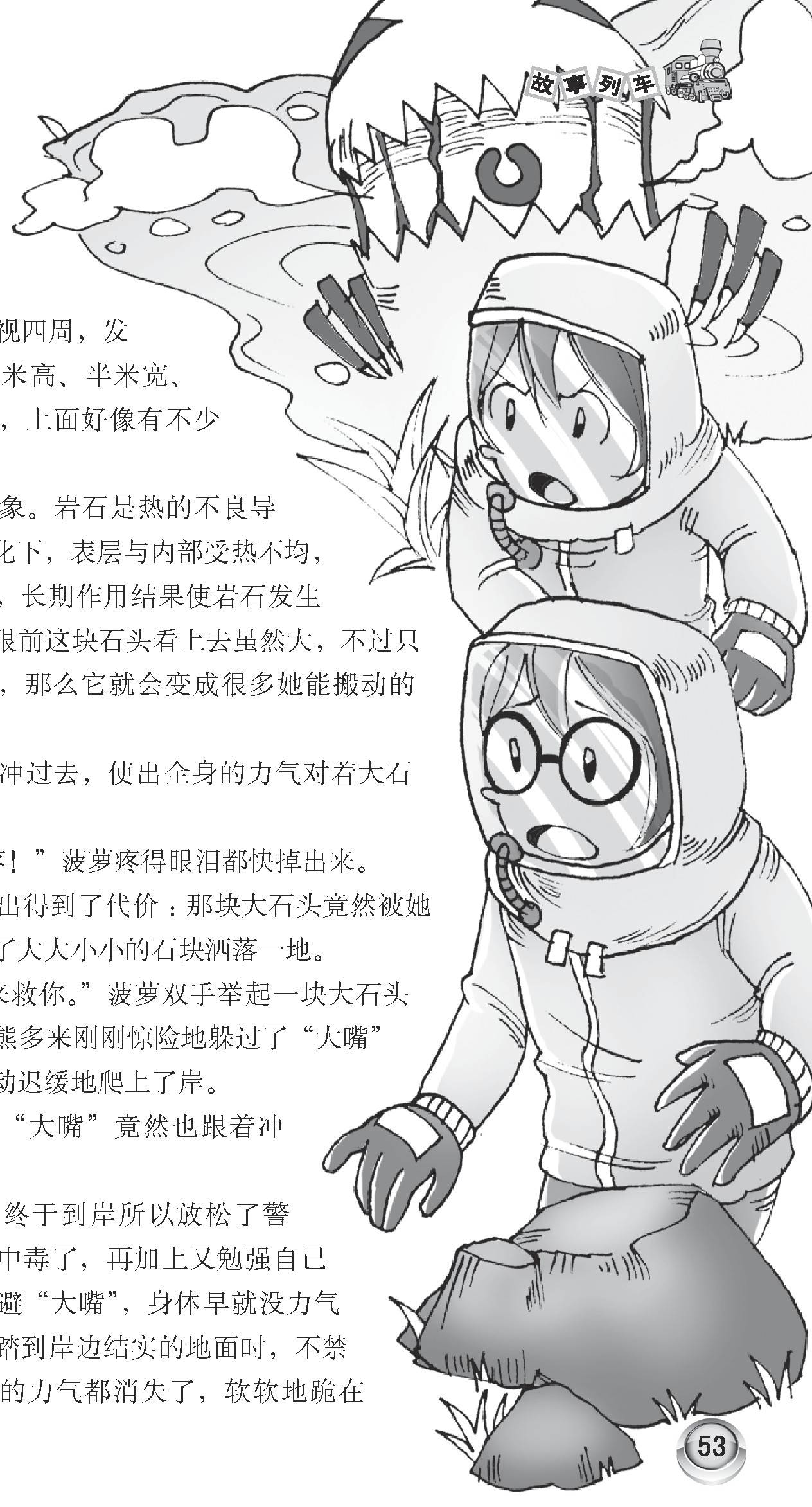 菠萝急忙环视四周,发现岸边有一块一米高、半米宽、半米长的大石头,上面好像有不少细碎的裂纹。