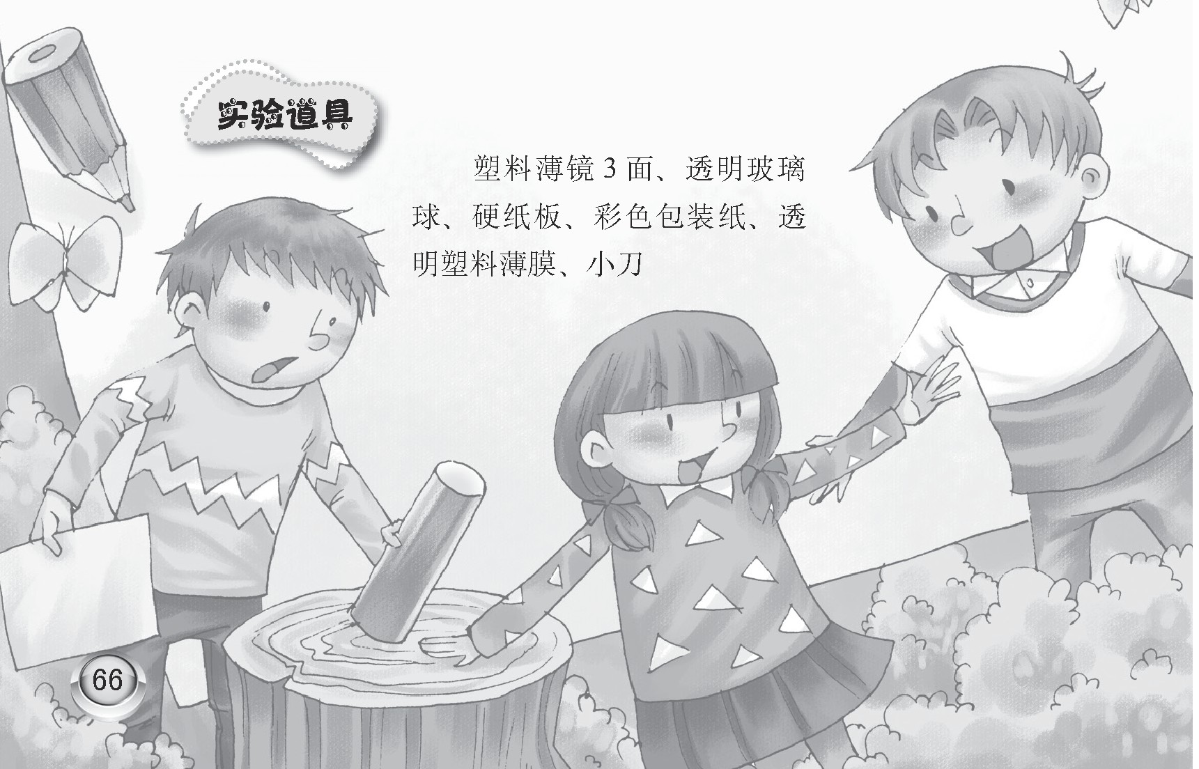 塑料薄镜3面、透明玻璃球、硬纸板、彩色包装纸、透明塑料薄膜、小刀