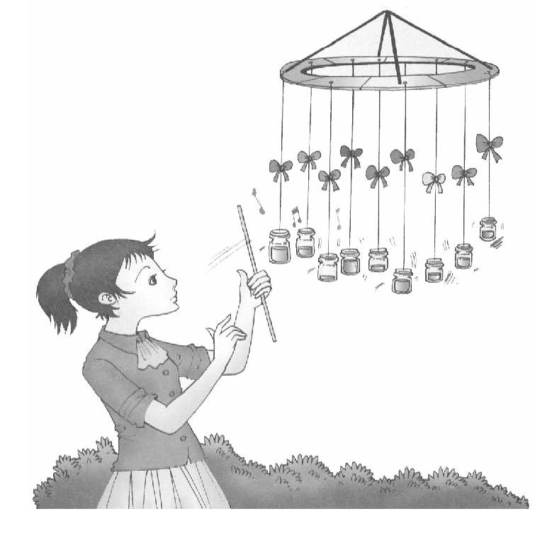 当玻璃瓶里装的水深浅不同时,我们敲击玻璃瓶会发出不同的声音。适当地调节水量,可以得到我们自己喜欢的声音。