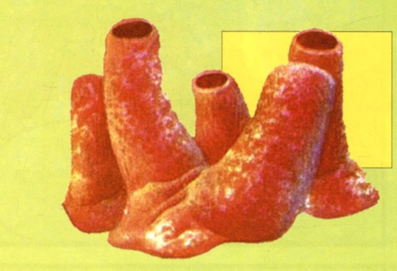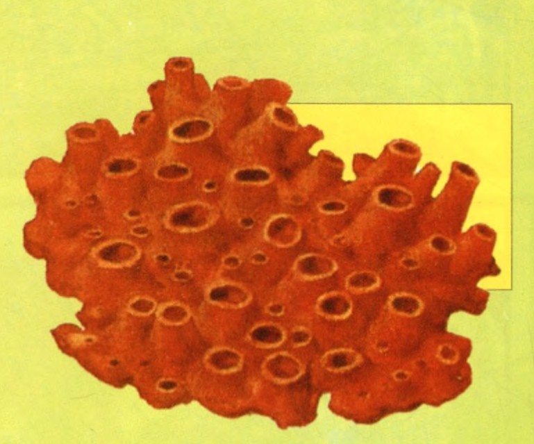 海绵没有嘴,没有消化腔,也没有中枢神经系统,只有最简单最原始的结构。它们的形状各异,千姿百态,有的像管子,有的像瓶子,有的像球体,有的像扇子。它们的颜色美丽多彩,有鲜红、银灰,也有白色的。海绵的个体大小相差很大,小的身长仅几毫米,大的长达十几米,有的还聚在一起形成2米高的群落,状似巨大的高脚酒杯或长笛。