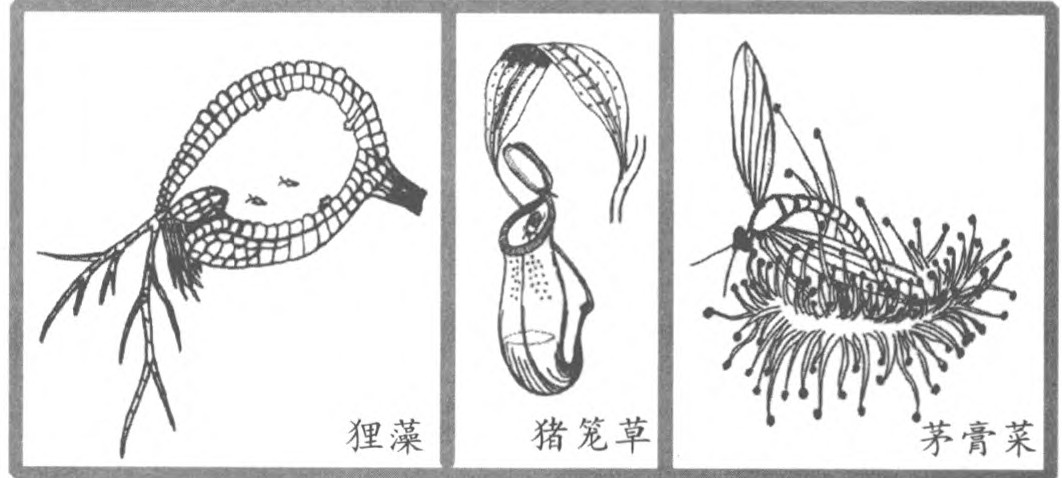 狸藻生活在水中,它能捕捉水中的一些小动物。这种植物有一部分叶变态成囊状,每个囊有一开口,并由一活瓣充当门户。活瓣只能向内开启,外面有硬毛可以挡住动物的去路。小动物触及硬毛时,活瓣开启,那些原生动物、水蚤或小鱼就会随水流入,狸藻随即将活瓣关闭。被关住的小动物再也无法出去,只好任其宰割。狸藻这种捕食技巧与人类常用的“关门打狗”战术真是如出一辙。
