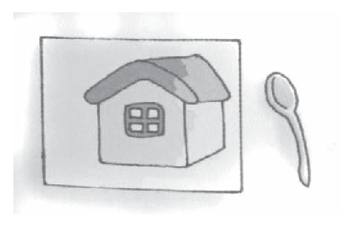 3把新画的图放在汤匙凸面的前方,向汤匙凸面看就会发现走样儿的房子又被矫正过来了(如果还有些变形,可以前后移动你的汤匙,直到形状正常)。这是为什么呢?