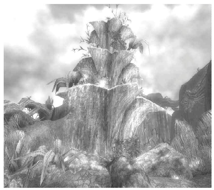 雨渐渐地小了,岩石裸露出本来的面目——暗红色、翠绿色、古铜色,五彩缤纷,与山脚下的湖泊交相辉映。岩洞的背阴面,一种奇怪的绿色物质正在扩散,它在生长,是生命!