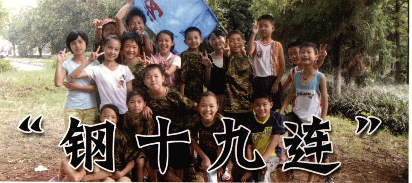 先说说我们队的队名吧!它叫:钢十九连。“钢”的含义是:我们队要像钢铁一样坚韧无比。“十九”的含义是:我们队有十八名队员加一名生活老师。“连”的含义是:我们队十九名队员要心连心,不能闹内部矛盾!呵呵,很有创意吧!下面再说一说我们的队旗吧!我们的队旗是天蓝色的底色,中间一个大红的“钢”字,“钢”的下面分别是“十”和“九”字。我们的队歌是根据军歌《打靶归来》改编的:“钢十九连永不败,勇往直前不怕累,不怕累……”我们的口号是:永不言弃,永不言败!