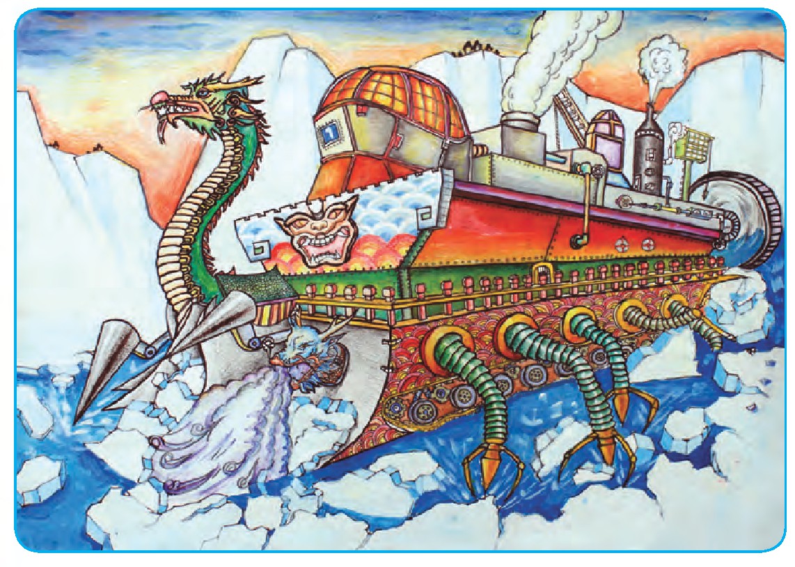 以青龙为化身,配备了动力强大的蒸汽机的雪龙六号破冰船,船头安装重锤,可以轻易击碎冰层,船身四周安装了伸缩爪,可以凿碎船两边的冰块,船底的坦克式履带,使破冰船能平稳地行驶在冰面上……有了雪龙六号,再厚的冰层也挡不住我们前进的脚步了。