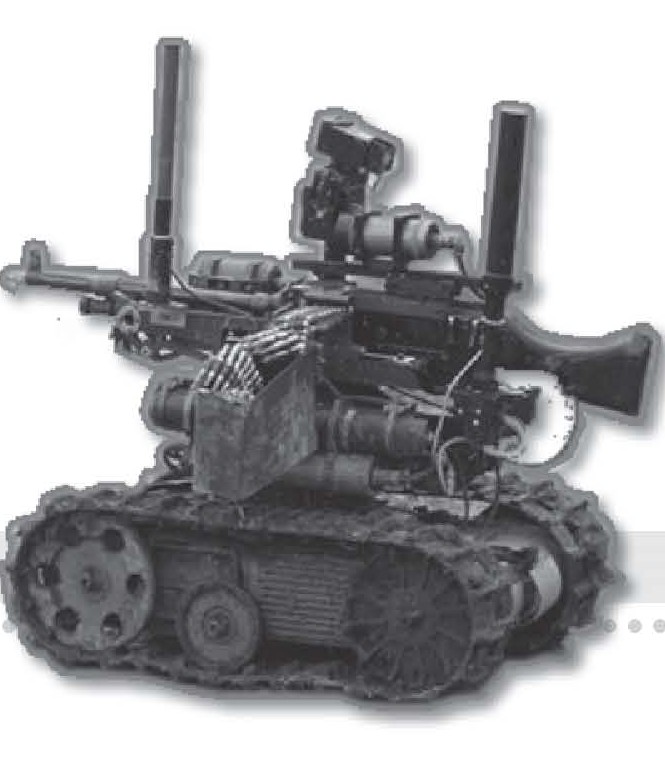同学们,小心脚下,眼前的这个可不是玩具车哦,它是一辆装有机枪的无人地面车!在士兵不易到达或者条件艰苦的战区,无人地面车可以大显神威。看到它那一排排子弹了吧,嚯嚯,这可是真枪实弹哦!
