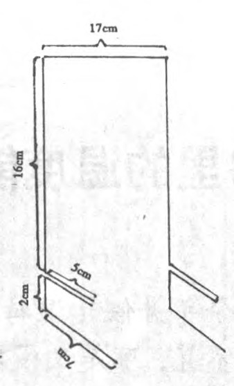 架子制作方法:用一根长约100厘米的铁丝(不宜太硬,手能扭动为好)首先扭成一个三面合口的长方式(与肩平行的一边留17厘米),再在两边铁丝16厘米处,向前弯90度,约在5厘米处,再向回折5厘米,相互靠上。然后向下弯90度,留出2厘米处,再向前弯90度,留下7厘米后剪断,这样就做出了 一个卡环可卡在桌子边上,上面三面合口的长方式铁架恰贴胸而放,保证写字看书时胸部挺直。