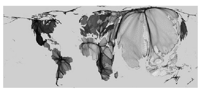 左边这张世界地图是不是很奇特?这是英国科学家根据世界人口的分布状况绘制的世界地图。这张地图显示了全球人口的分布状况,以及相对于人口比例每个国家的大小。中国、印度和日本因是世界上人口最多的国家之一,在新世界地图上所占的比例也很大。英国在这张地图上变得面目全非,而澳大利亚作为世界上国土面积最大的国家之一,因人口相对较少,也被赋予极不相称的地位。