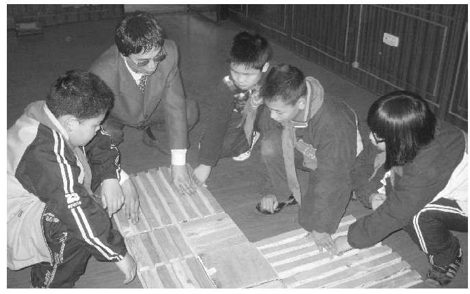 基本思路:在盲道的转弯、停止、上下坡等处,分别用少量不同的信息(突起、语音等)来表示。这样,盲人就可以早一点知道路况了。我们针对各小组成员提出的不同的方案进行讨论、研究,并进一步完善、确定方案,做出模型让盲人试用,从而验证作品的性能及可靠性。