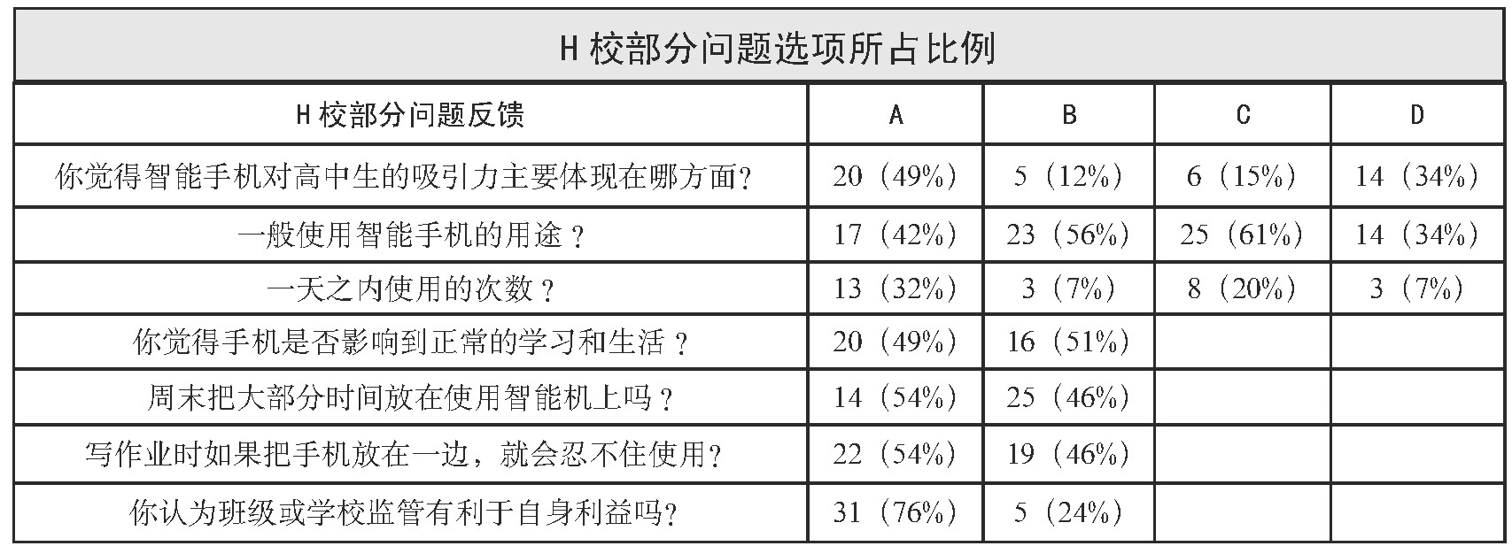 调查结论:根据结果,我们可以看出H校的学生在学校或班级的监管下能够严格自控。