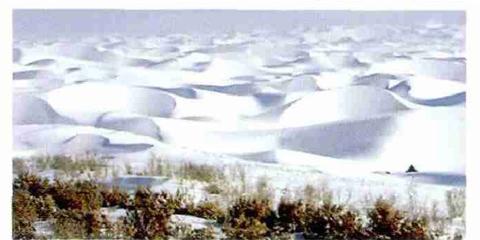 下雪啦,下雪啦。真是太幸运了,沙漠地区降雪,在全球都是非常罕见的。风雪肆虐过后,连绵的沙丘无影无踪,昔日的黄色“瀚海”变成波澜壮阔的银色雪原”。